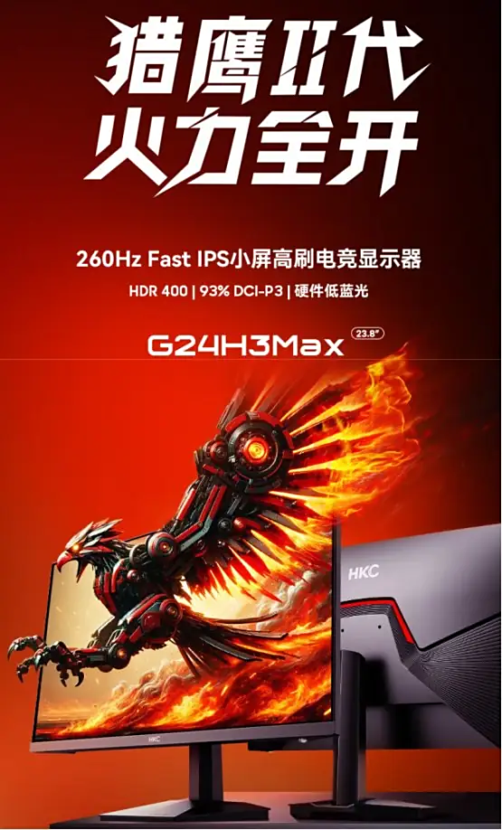 2025 年 8 月,国内显示器厂商 HKC 再次更新旗下“猎鹰二代”电竞显示器系列产品 ——G24H3Max 与 G27H2Max。前者以 23.8 英寸黄金尺寸与 260Hz 超频刷新率成为“小钢炮”标杆,后者凭借 27 英寸 2K 分辨率 220Hz 高刷全能表现,再次定义“千元全能屏”的新标准,为玩家提供从入门到进阶的全场景解决方案。