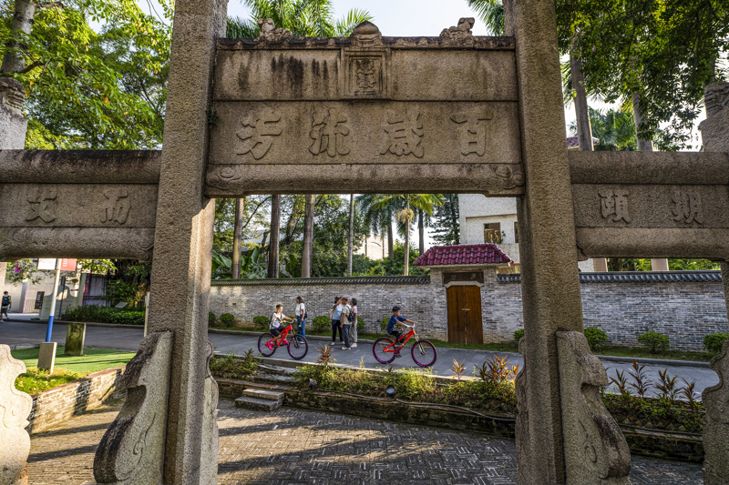 孩子们骑车经过塱头村的升平人瑞牌坊。远处白色建筑是春阳台艺文中心。