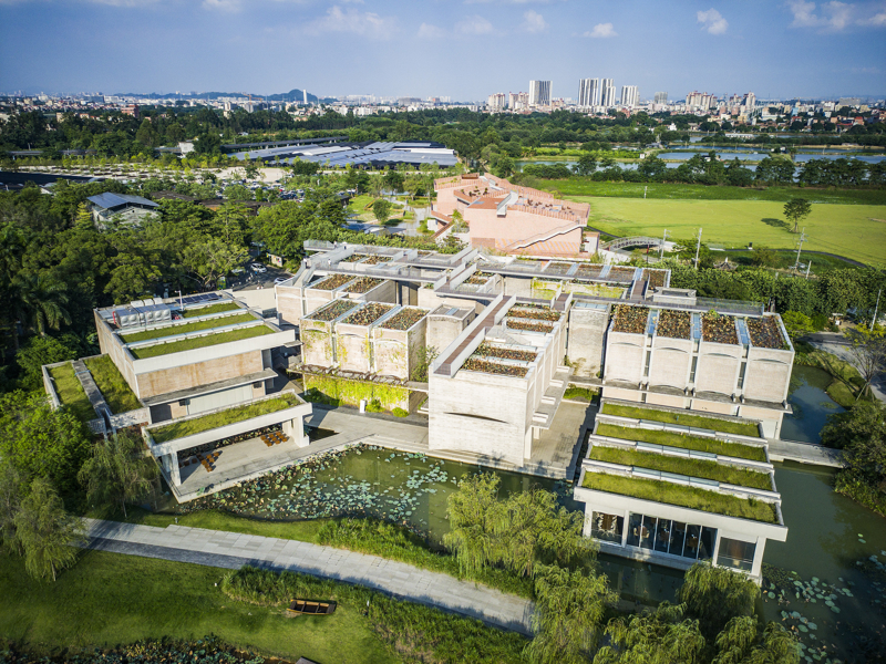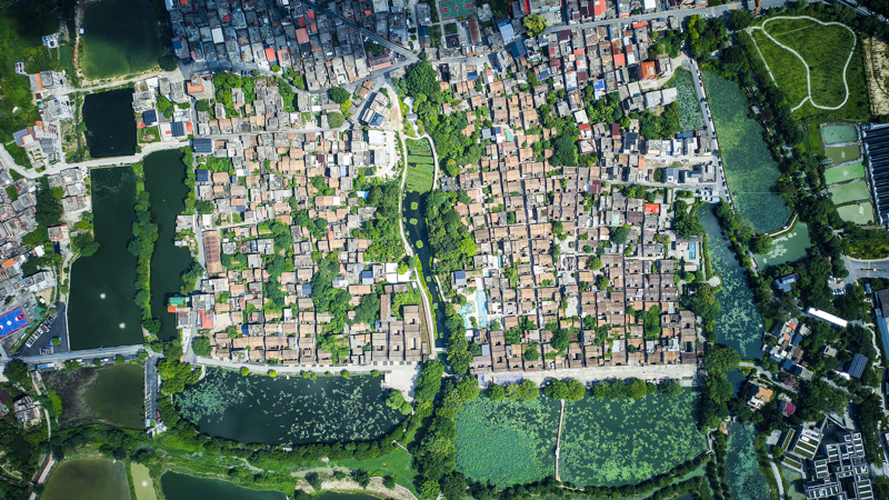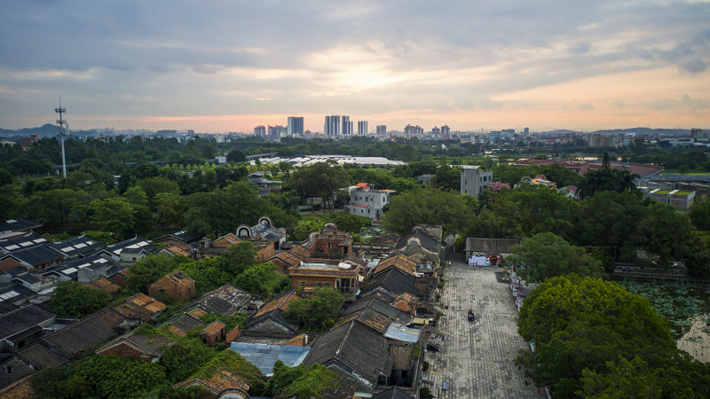 塱头村的左侧为古村建筑,右侧为春阳台艺文中心(无人机全景照片)。