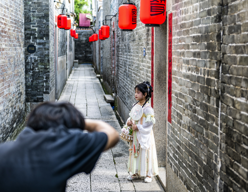 摄影师在塱头村积墨楼为孩子拍摄古风写真。