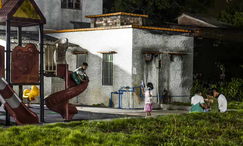 孩子们在塱头村新村的公共游乐设施玩耍。
