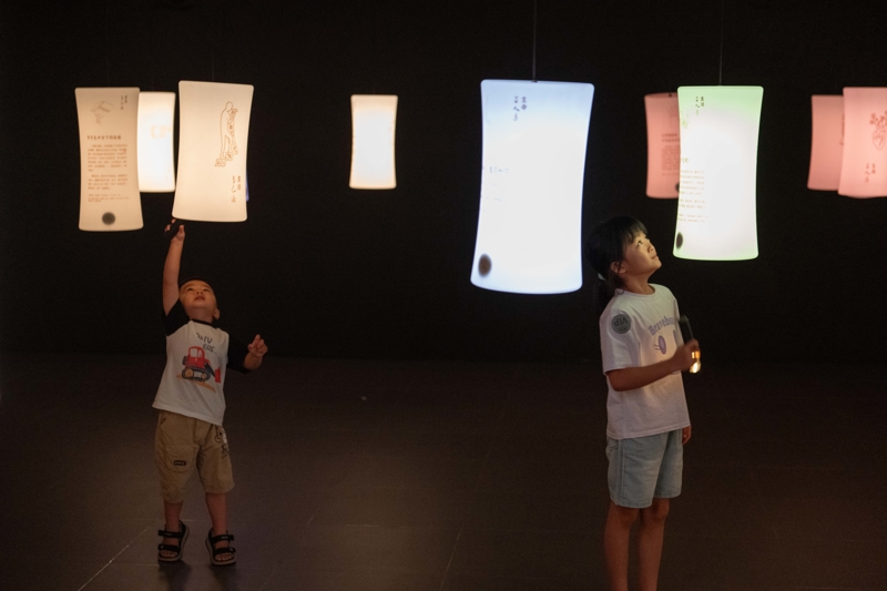 孩子们在塱头村春阳台艺文中心的展览中体验一个空间互动装置。