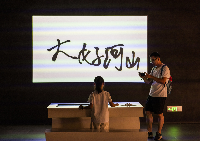 游客带孩子在塱头村的春阳台艺文中心体验书法互动装置。