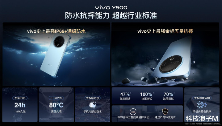 而在防护方面,vivo Y500不同于其他同价位急性,仅仅具备基础防水能力,它通过了IP68/69/69+三项满级防水认证,能应对1.5米水深浸泡24小时、80℃高温喷水等严苛场景,这背后是机身密封工艺与防水涂层技术的优化。同时,刚磐石架构通过内部结构强化与外部抗摔设计,让手机抗摔性能大幅提升。