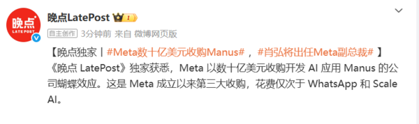 [CNMO科技消息]12月30日,据《晚点LatePost》报道,Meta以数十亿美元收购开发AI应用Manus的公司蝴蝶效应。收购完成后,蝴蝶效应公司将保持独立运作,创始人肖弘出任Meta副总裁。这是Meta成立以来第三大收购股票配资行情,花费仅次于WhatsApp和ScaleAI。